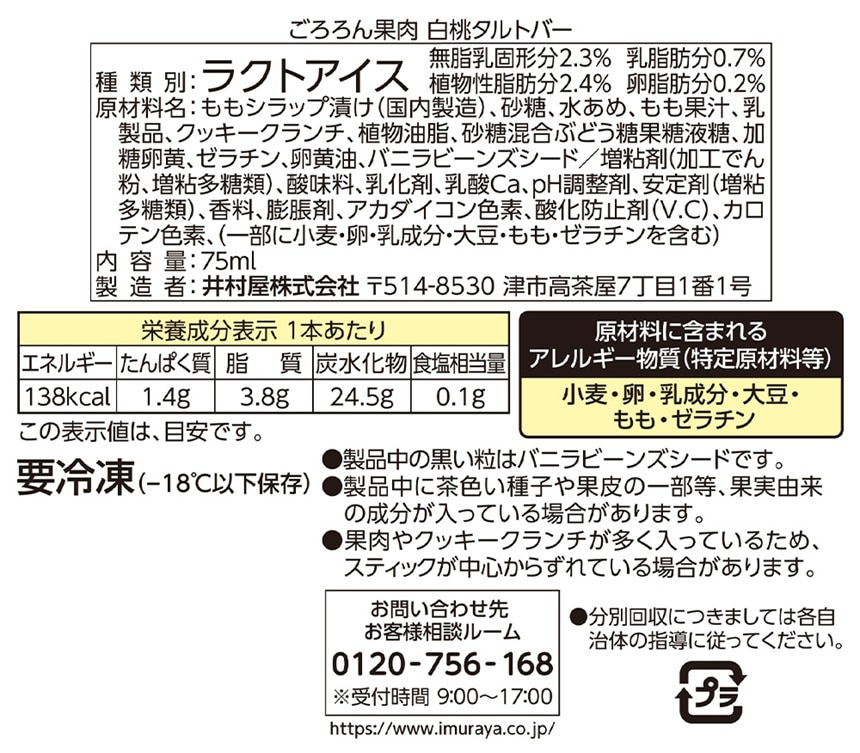 - [冷凍]井村屋 ごろろん果肉 白桃タルトバー 75ml×20個