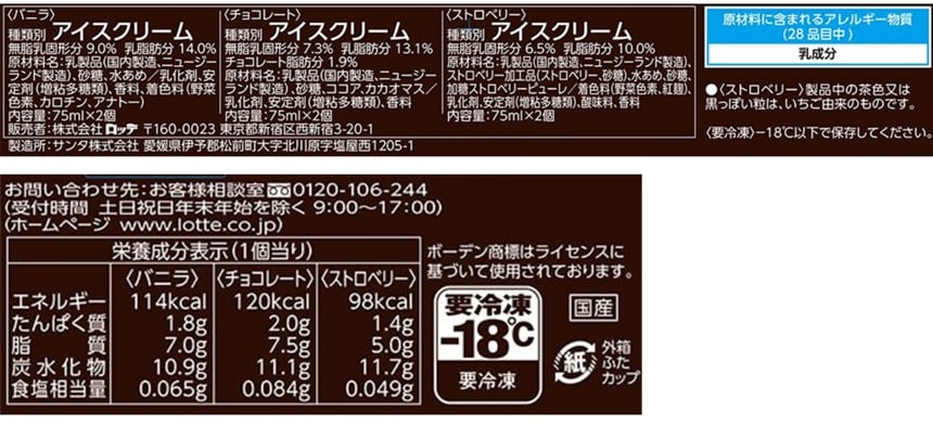 ※アイスクリーム類は、-18度以下での冷凍保存の状態では、品質の劣化が極めて小さい食品ということで、賞味期限の設定がされておりません。