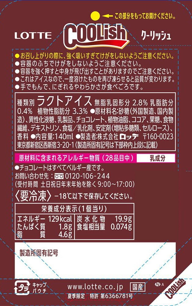 [冷凍]ロッテ クーリッシュ ベルギーチョコレート 140ml×24個 | 濃いめの味わいが楽しめる冬向けのクーリッシュです。