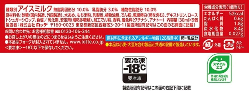 ※アイスクリーム類は、-18度以下での冷凍保存の状態では、品質の劣化が極めて小さい食品ということで、賞味期限の設定がされておりません。
