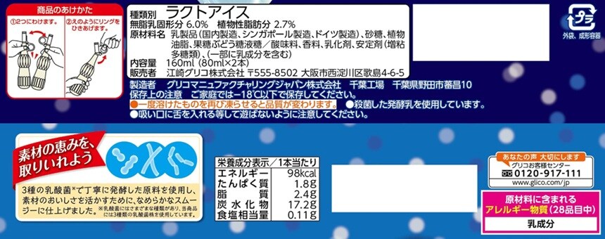 ※アイスクリーム類は、-18度以下での冷凍保存の状態では、品質の劣化が極めて小さい食品ということで、賞味期限の設定がされておりません。