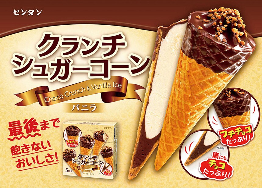アイス部をチョコで全面コートしているため、クランチのカリカリした食感とシュガーコーンのサクサクした食感が持続します。