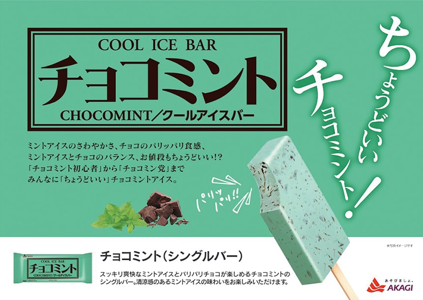 ミントアイスの爽快さと、チョコチップのパリパリ食感が手軽に楽しめるアイスバー。