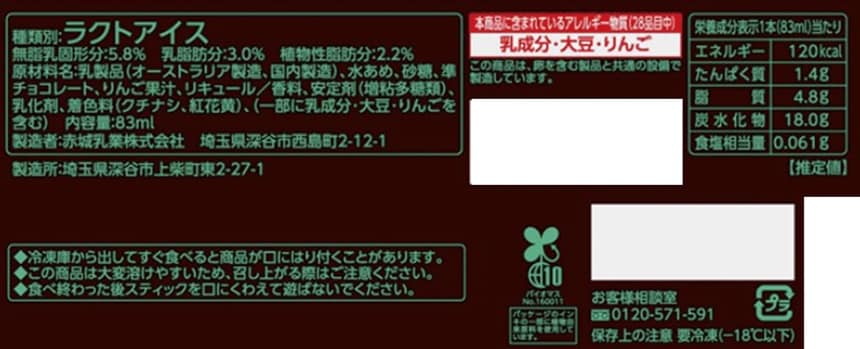 ※アイスクリーム類は、-18度以下での冷凍保存の状態では、品質の劣化が極めて小さい食品ということで、賞味期限の設定がされておりません。