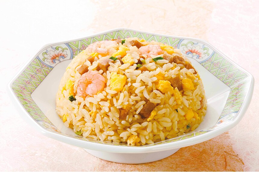 えび、焼豚、ねぎ、しいたけ、卵など具たくさんタイプです。ふっくらごはんに仕上げています。陳建一オリジナルスープ”美味湯”でコクのある味付けをしています。パラパラに、香ばしく焼き上げています。
