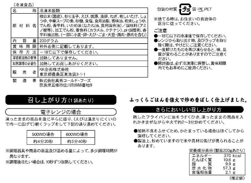熱したフライパンに油をうすくひき、凍ったままの商品を入れかきまぜながら中火で約2~3分炒めてください。