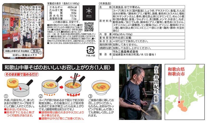 - [冷凍]マルニ食品 そのまま和歌山中華そば 井出商店豚骨醤油味 480g×8袋