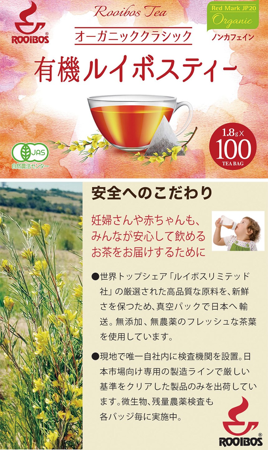 - 【WEB限定】オーガニックルイボスティー 100包入(1.8g×100包)水出し可能 ティーパック 個包装 レッドマークJP20グレード茶葉使用 大容量×6個