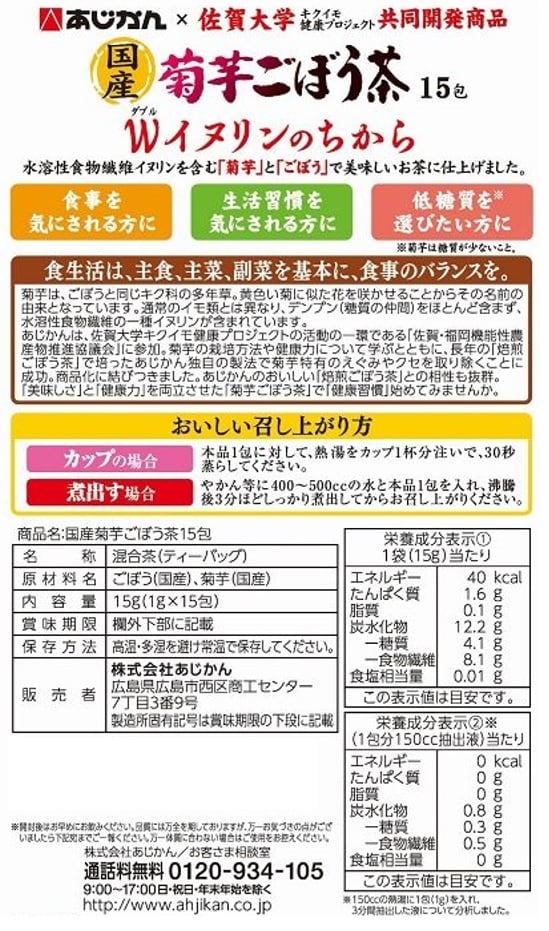 [計150杯]あじかん 国産菊芋ごぼう茶 15包入×10個 | 長年の「焙煎ごぼう茶」で培ったあじかん独自の製法で菊芋特有のえぐみやクセを取り除いた商品です。