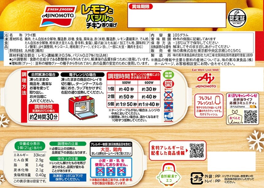 - [冷凍]味の素 レモンとバジルのチキン香り揚げ 5個×12袋