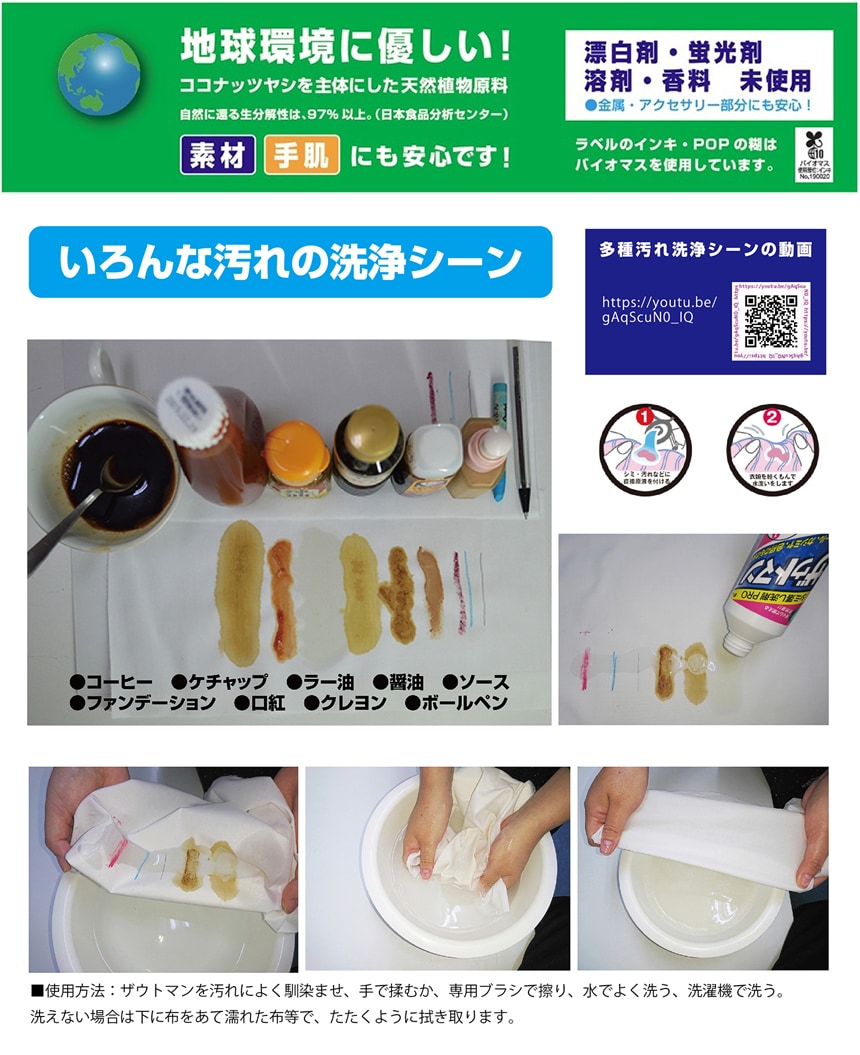 ●漂白剤・蛍光剤・溶剤・香料は無配合で、素材・金属部分・アクセサリー等にも安心です。