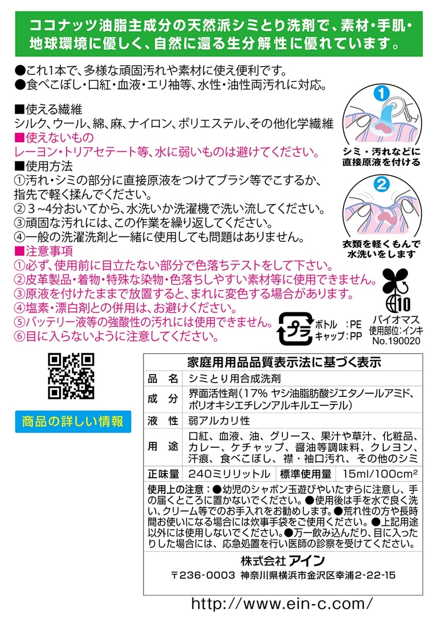 [4個]アイン シミとり洗剤 ザウトマン 240ml | 天然のココナツヤシ油が主成分の高級グレード洗剤です。