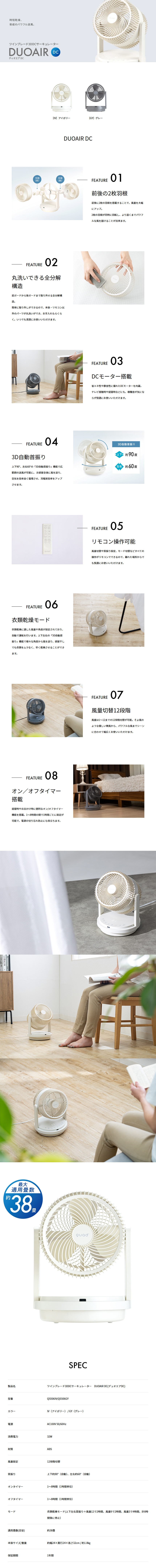[アイボリー]クワッズ/ツインブレード3D DCサーキュレーター「デュオエアDC」(前後2枚羽根/衣類乾燥モード/12段階切替)|前後に2枚の羽根搭載!風量を大幅にアップ!時短乾燥、脅威のパワフル送風