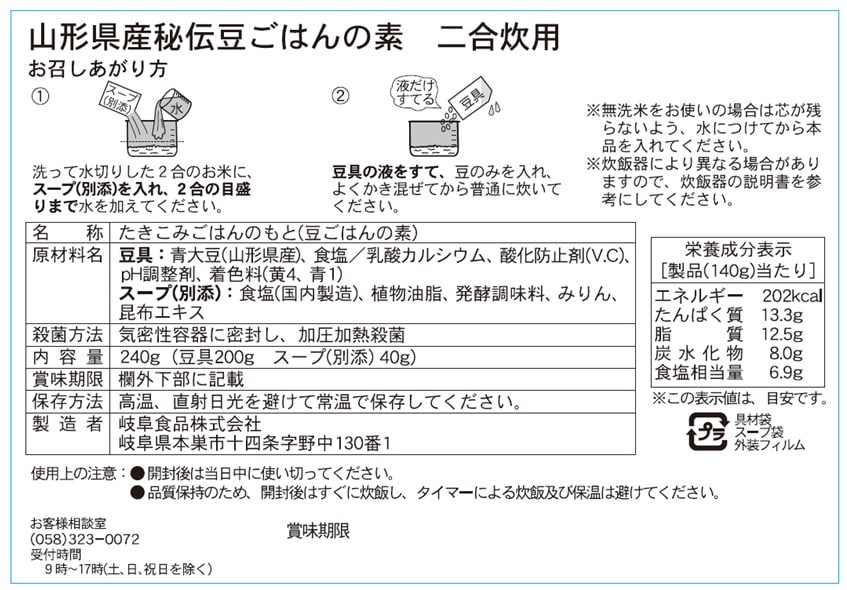 甘さ、香り、、実の張り、どれをとっても最高という意味を込めて名づけられた山形県産の"秘伝豆"を使用したごはんの素です。