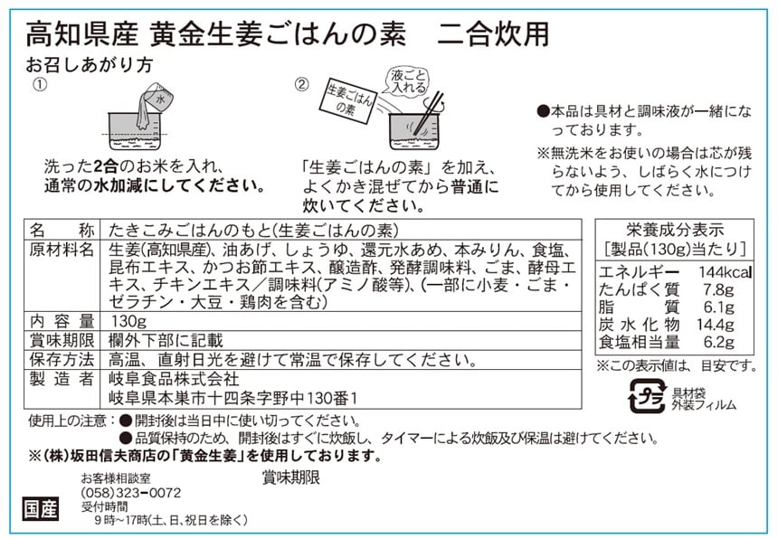 ・高知県産生姜ごはんの素 130g×6個 - 賞味期限