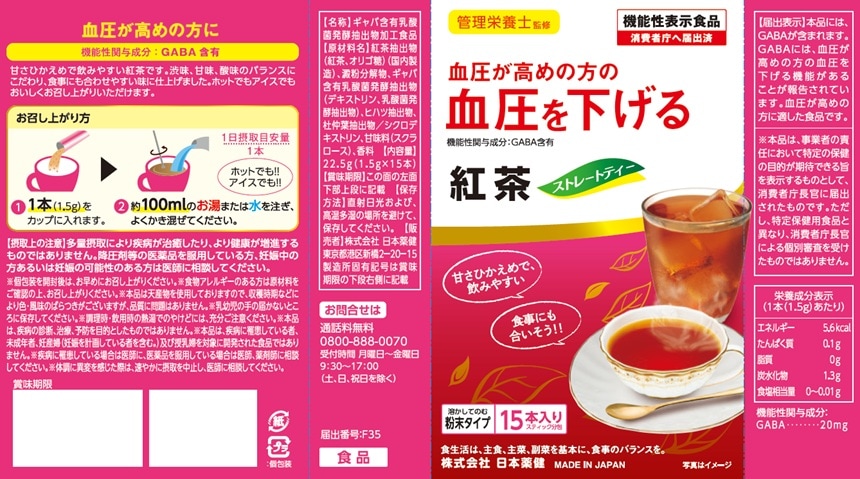 血圧が高めの方の血圧を下げる、機能性関与成分としてGABAを配合した溶かして飲む、粉末タイプの紅茶です。機能性表示食品。