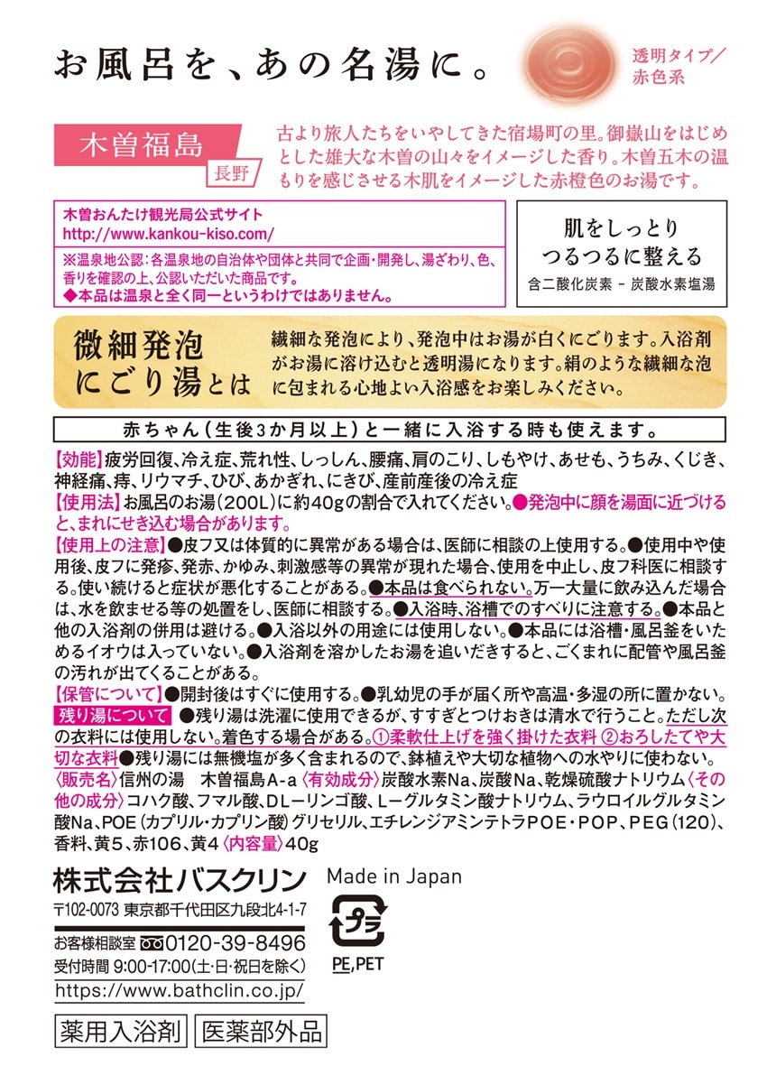 [12包]【医薬部外品】 バスクリン 日本の名湯 夢ごこち 木曽福島 40g | 「絹のような泡まとうしあわせ」新感覚の微細発泡にごり湯タイプの入浴剤