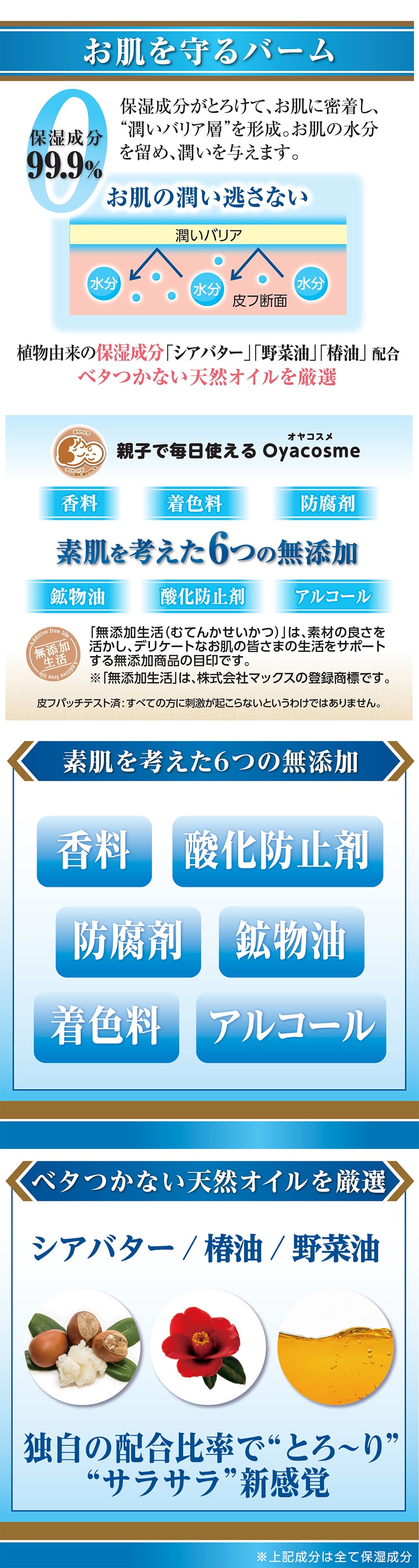 べトつかない潤いバリア「無添加」の保湿バーム。植物由来のベタつかない天然オイルを厳選配合(保湿成分)。6つの無添加、香料・着色料・防腐剤・鉱物油・酸化防止剤・アルコール無添加・保湿効果とさらさらの使用感を同時実現。保湿成分99.9%。