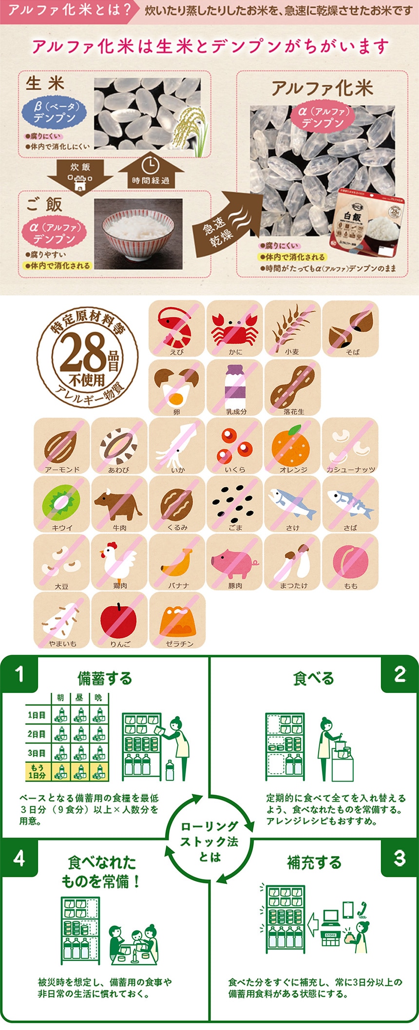 特定原材料等(アレルギー物質)28品目不使用の食物アレルギーをお持ちの方にも配慮した長期保存食。