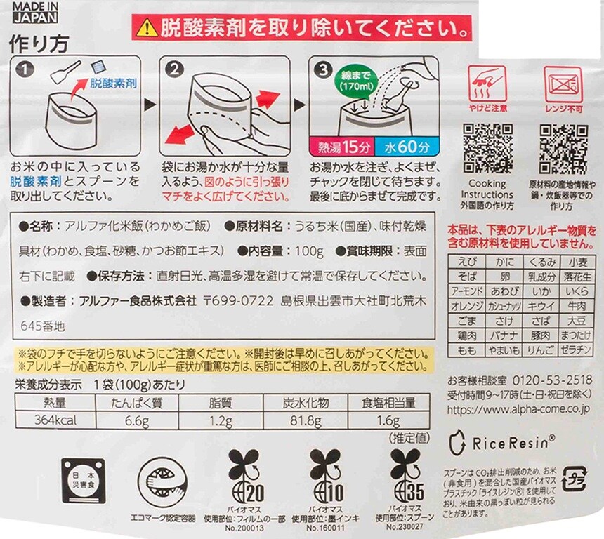 アルファー食品 安心米 長期保存 非常食 わかめご飯 100g×15個 | 国産うるち米100%使用。