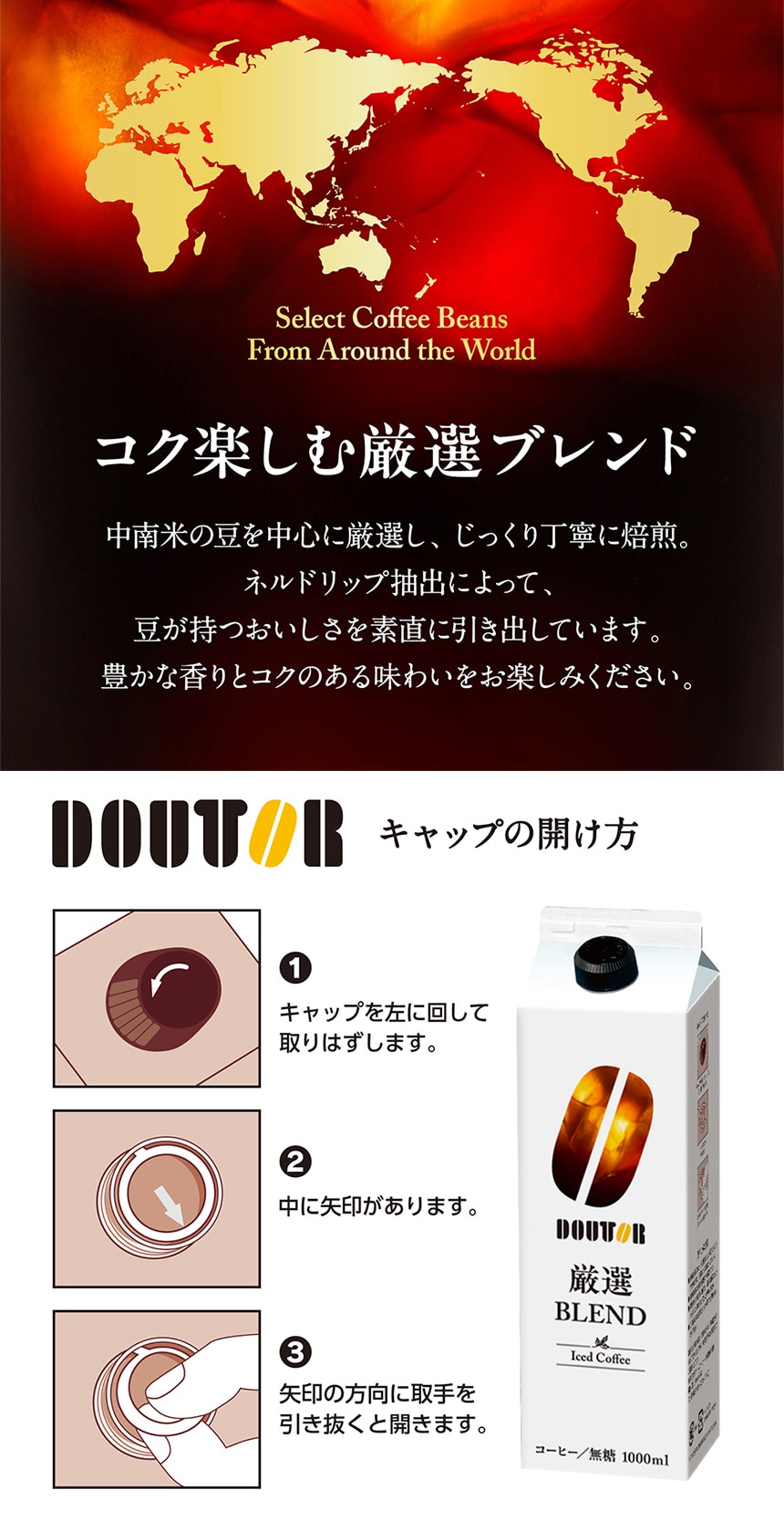 ドトールコーヒー アイスコーヒー厳選ブレンド無糖 1000ml×3本 | 「ブラジル」コクのある「コロンビアホンジュラス」など中南米をメインとしたブレンドが完成しました。