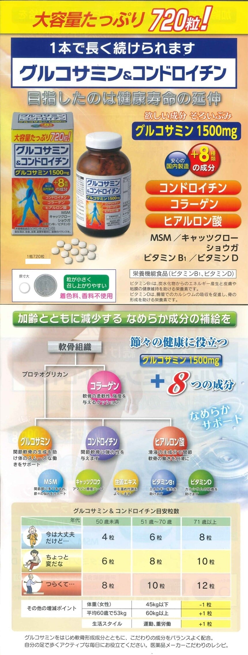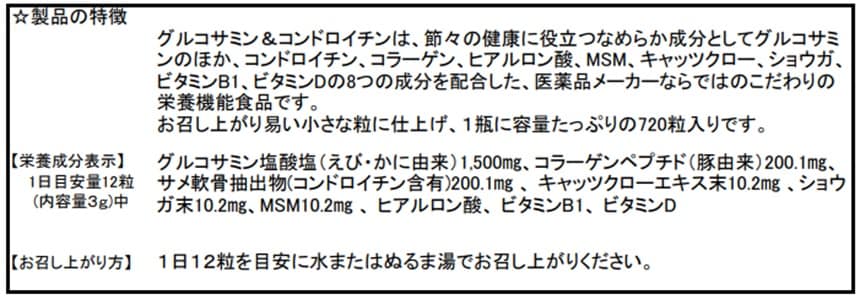 グルコサミン&コンドロイチンは、節々の健康に役立つなめらか成分としてグルコサミンのほか、コンドロイチン、コラーゲン、ヒアルロン酸、MSM、キャッツクロー、ショウガ、ビタミンB1、ビタミンDの8つの成分を配合した、医薬品メーカーならではのこだわりの栄養機能食品です。