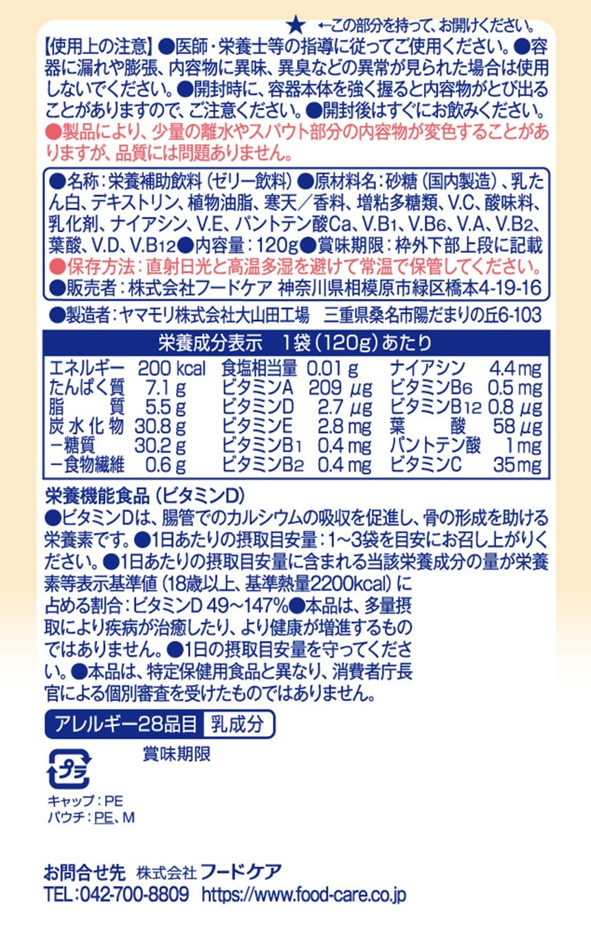片手で押し出しやすいスパウト付きパウチタイプ1袋(120g)でエネルギー200kcalたんぱく質7.1g!