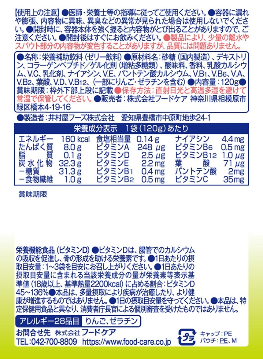 容量 120g(106ml)エネルギー 160kcalたんぱく質 8.0g(コラーゲンペプチド 8.0g)11種類のビタミン1食事摂取基準2の約1/3(1:ビタミンKビオチンを除く11種類 2:2020年版)ビタミンD 2.5μg脂質 0.1gリンカリウムをほとんど含みません乳大豆不使用。