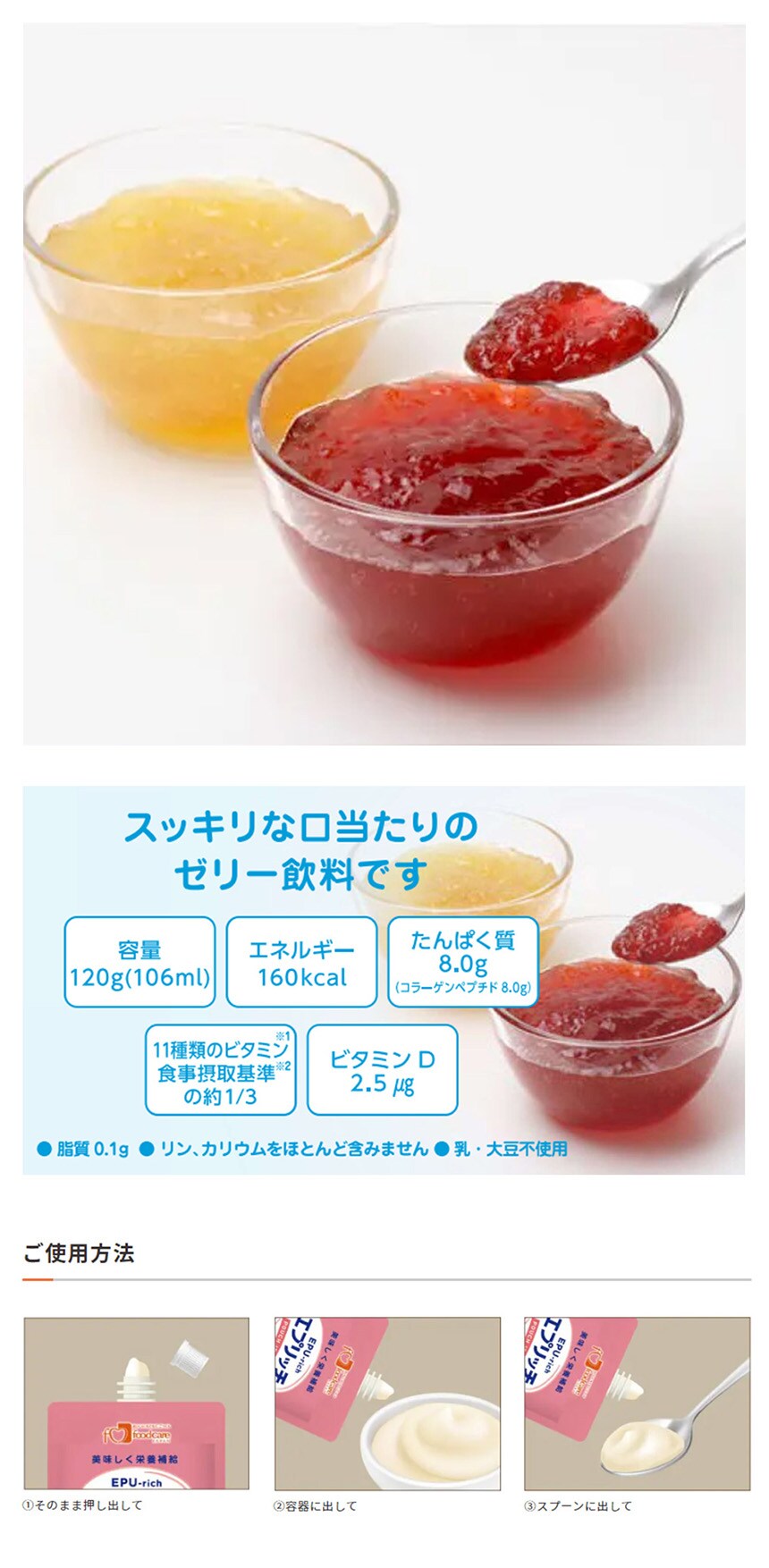 容量 120g(106ml)エネルギー 160kcalたんぱく質 8.0g(コラーゲンペプチド 8.0g)11種類のビタミン1食事摂取基準2の約1/3(1:ビタミンKビオチンを除く11種類 2:2020年版)ビタミンD 2.5μg脂質 0.1gリンカリウムをほとんど含みません乳大豆不使用。