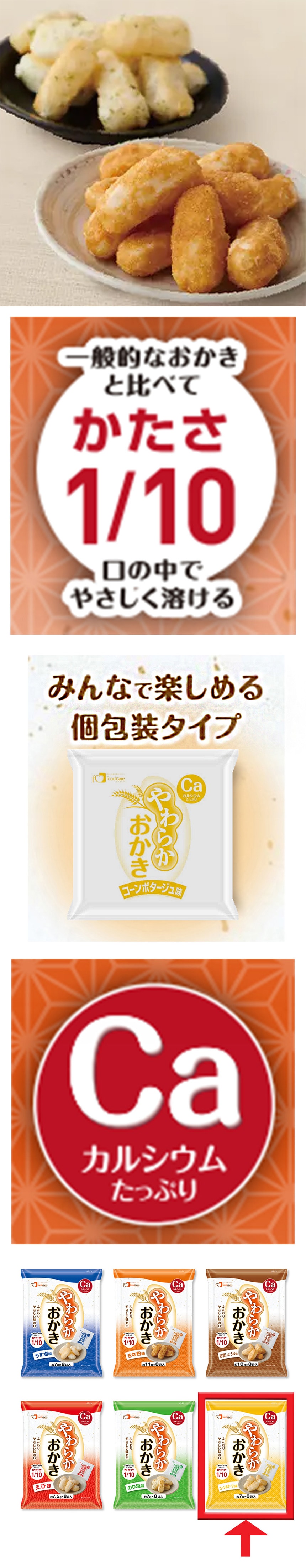 フードケア やわらかおかき コーンポタージュ味 56g×12個 | とてもやわらかくカルシウムもたっぷり口溶けの良いおかきです。