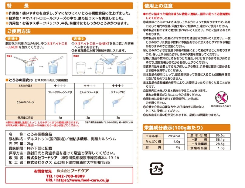 フードケア ネオハイトロミールNEXT 2kg×2個 | “使いやすさ”と”低コスト”の両立を実現したとろみ調整食品です。