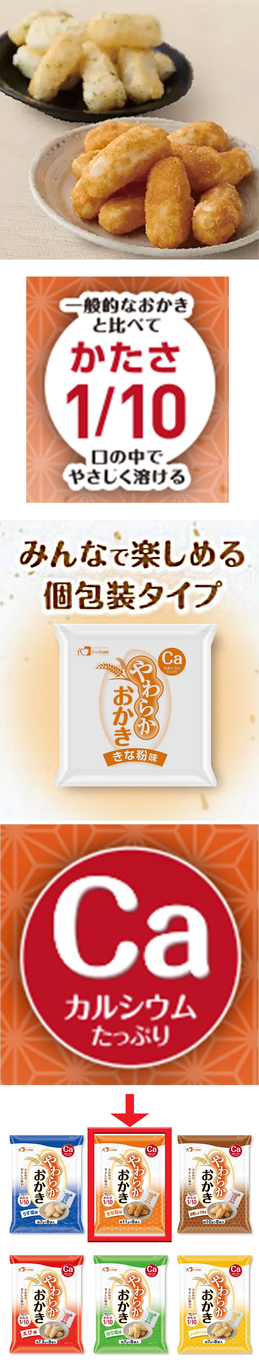 フードケア やわらかおかき きな粉味 88g×6個 | とてもやわらかくカルシウムもたっぷり口溶けの良いおかきです。