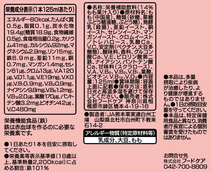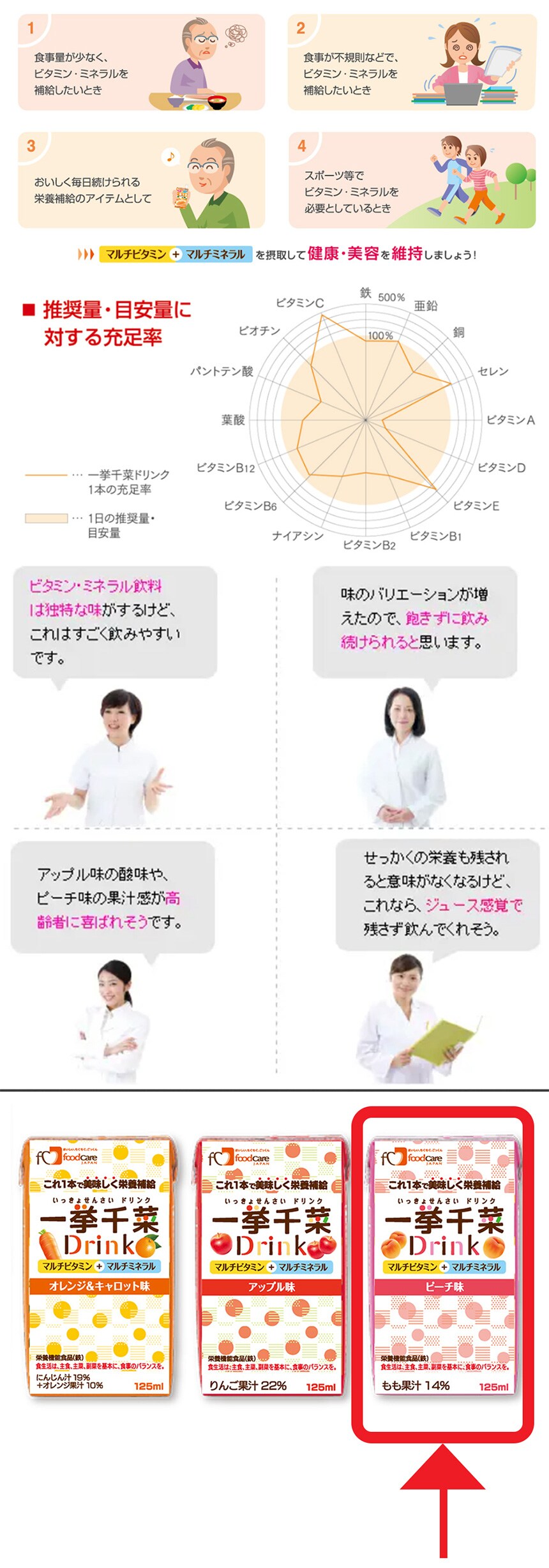 フードケア 一挙千菜ドリンク ピーチ味 125ml×18個 | 食生活で不足しがちな栄養素をバランスよくサポート!「毎日続けられるおいしさ」を追求しました。