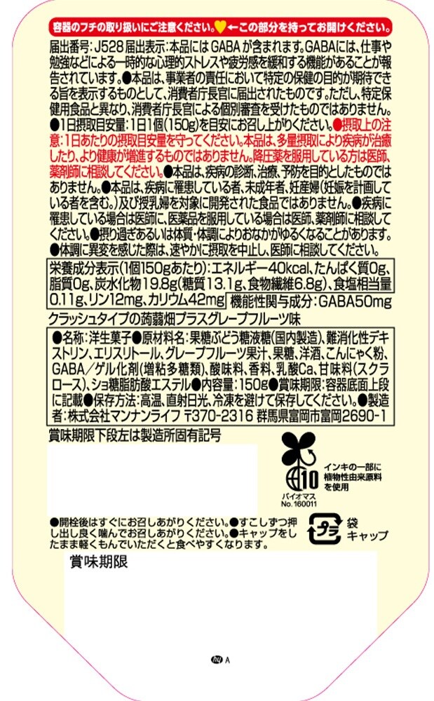 【機能性表示食品】マンナンライフ クラッシュタイプの蒟蒻畑プラス グレープフルーツ味 150g×12個 | 機能性関与成分GABAの働きで仕事や勉強などによる一時的な心理的ストレスや疲労感を緩和する。