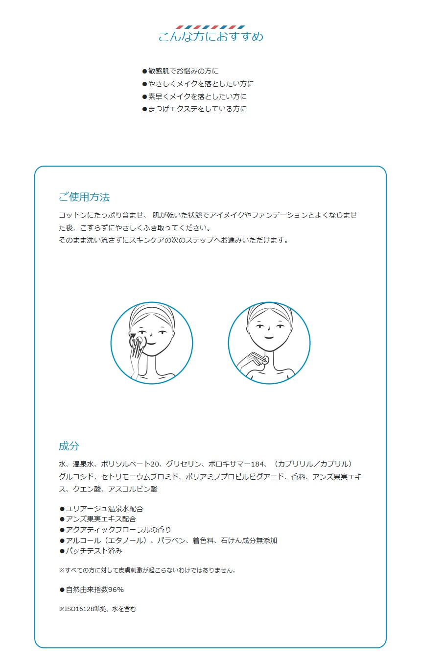 ユリアージュ温泉水*10%配合。ふき取りタイプのメイク落としです。