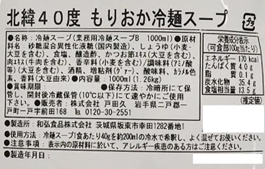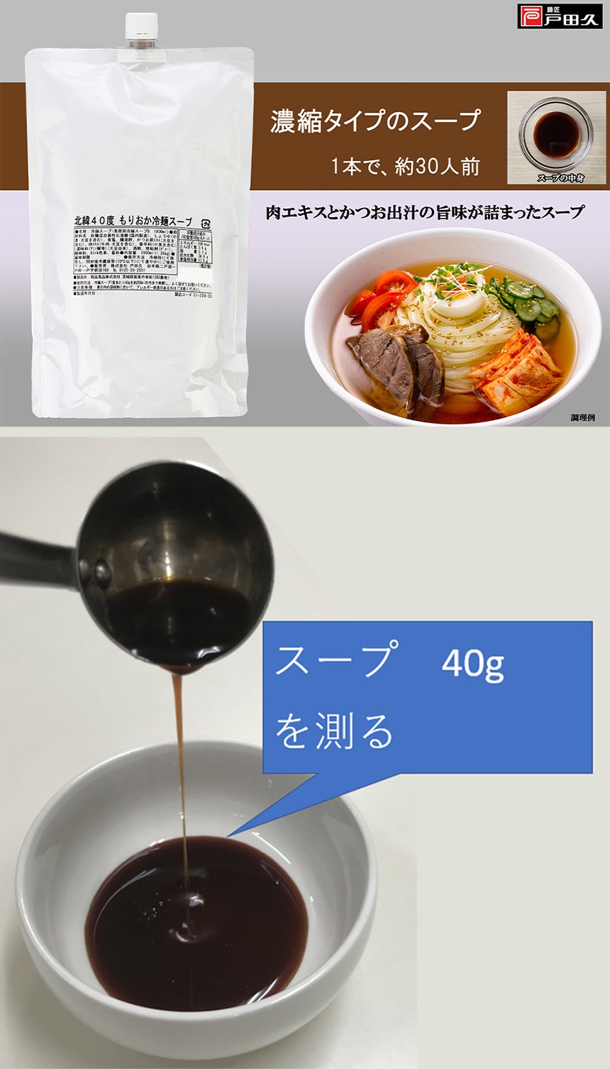 醤油ベースのスープで、市販品で最も売れている「戸田久もりおか冷麺」と同じような味わいです。