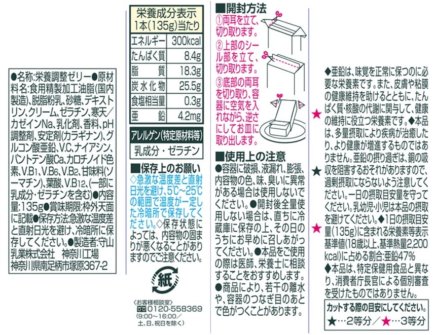 1本(135g)あたりエネルギー 300kcalたんぱく質 8.4g亜鉛 4.2mg。