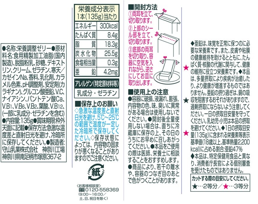 1本(135g)あたりエネルギー 300kcalたんぱく質 8.4g亜鉛 4.2mg。