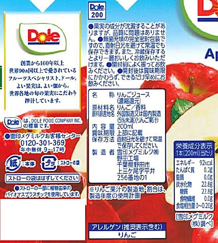 雪印メグミルク Doleアップル100% 200ml×12本 | 世界各地の旬の果実を使用しております。