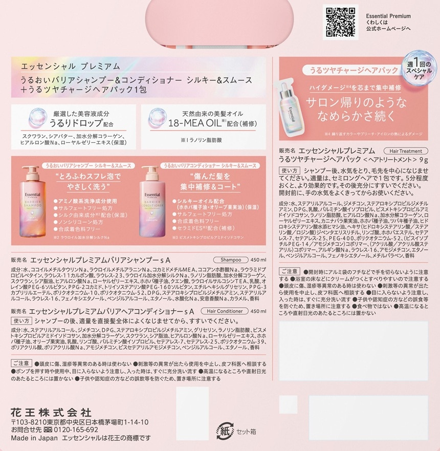 [3セット]花王 エッセンシャル プレミアム バリアシルキー&スムースポンプセット 900ml+うるツヤチャージヘアパック9g | エッセンシャルポンプペアセット。うるツヤチャージヘアパック1包つき!