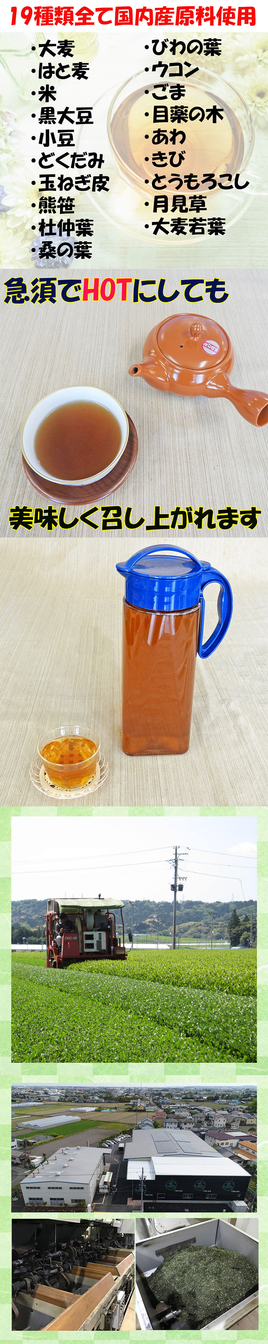 大麦、はと麦、玄米、黒大豆、小豆、どくだみ、たまねぎ皮、熊笹、杜仲葉、桑の葉、びわ葉、ウコン、ごま、目薬の木、あわ、きび、とうもろこし、月見草、大麦若葉をオリジナルの比率で配合しました。すべて国内産を使用しております。