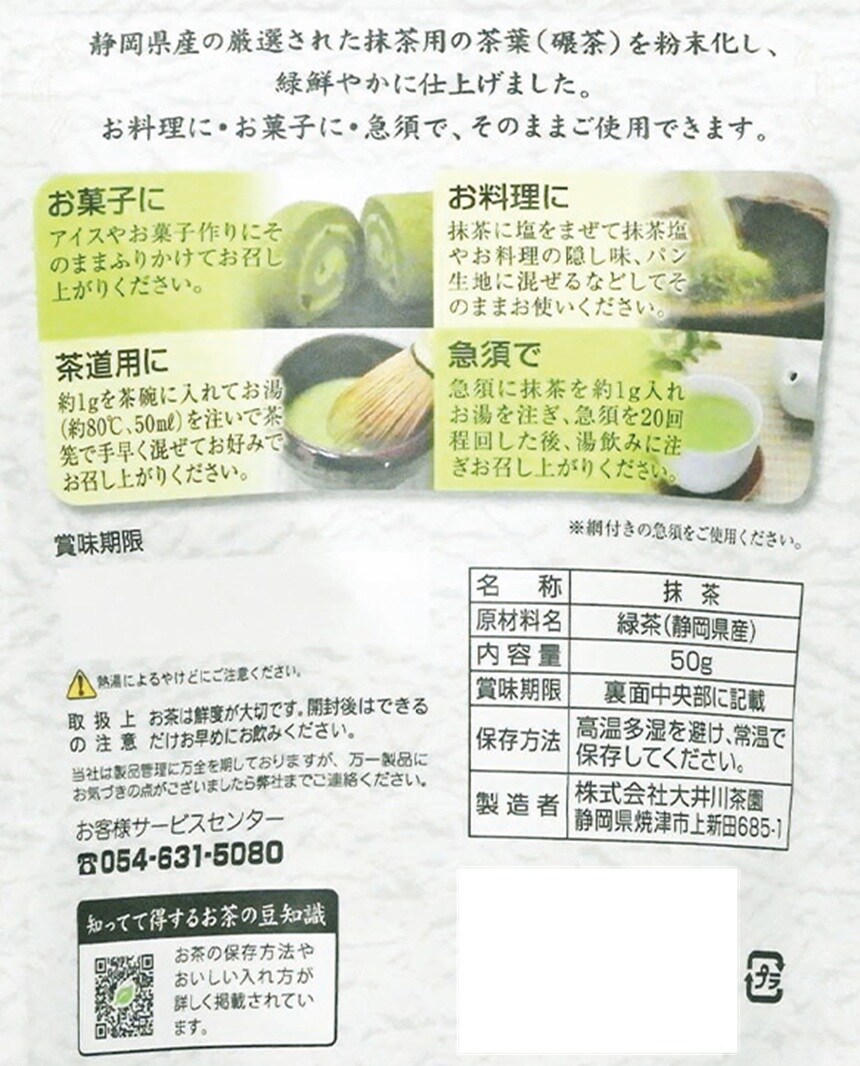 大井川茶園 静岡抹茶 50g×12個 | 厳選した静岡県産の茶葉(碾茶)を自社工場で丁寧に仕上げました。