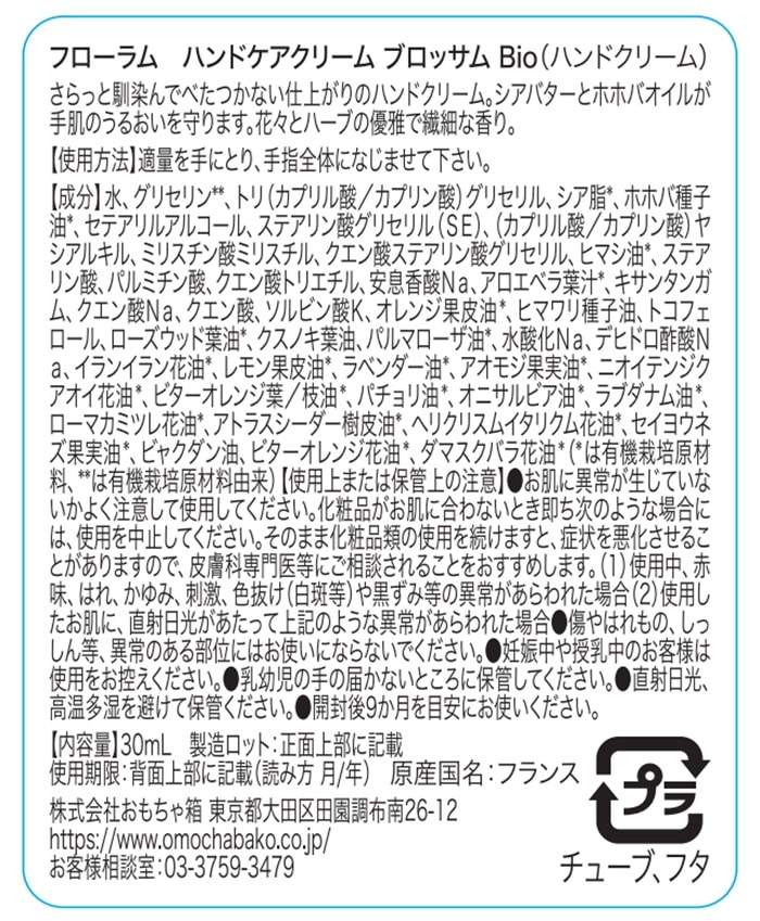 [5本]おもちゃ箱 フローラム ハンドケアクリーム ブロッサム Bio 30ml | さらっと馴染んでべたつかない仕上がりのハンドクリーム。
