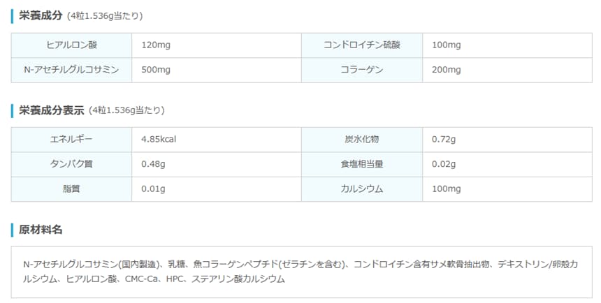 N-アセチルグルコサミンやコンドロイチン・コラーゲンなど膝関節のための成分を配合。