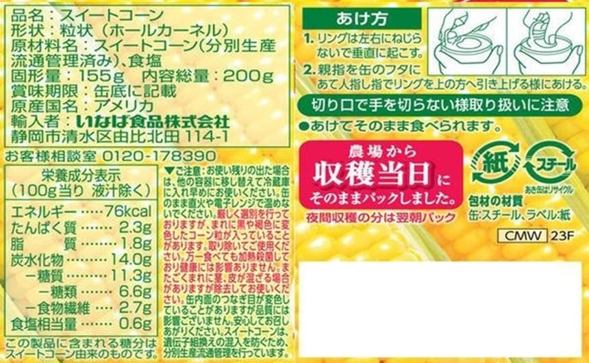 スーパースイートコーンを収穫から24時間以内にパックした、フレッシュなコーン缶です。