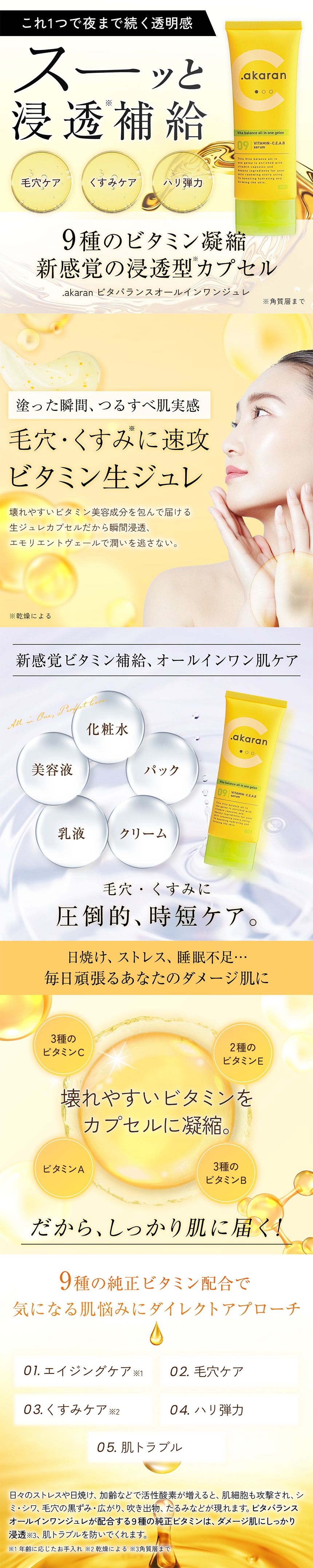 美肌に必要なビタミンA.C.B.Eをバランスよくカプセルに凝縮することで、時短で効率的にビタミン補給&スキンケアが叶うオールインワンジュレ。