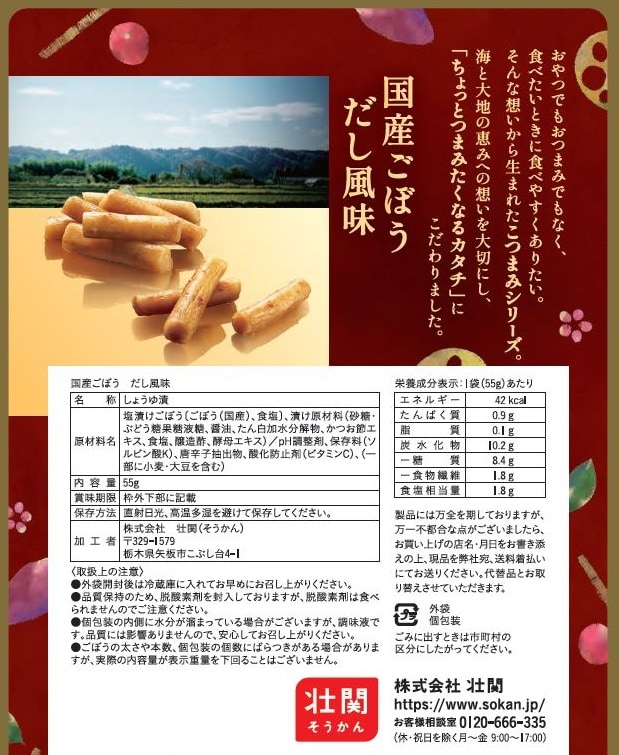 カリっと食感の国産若採れごぼうをひとくちサイズにカットし、甘みと塩味が効いただし風味に漬け込みました。個包装で食べやすい、食物繊維たっぷりの野菜のお菓子です。おやつ・おつまみにどうぞ。