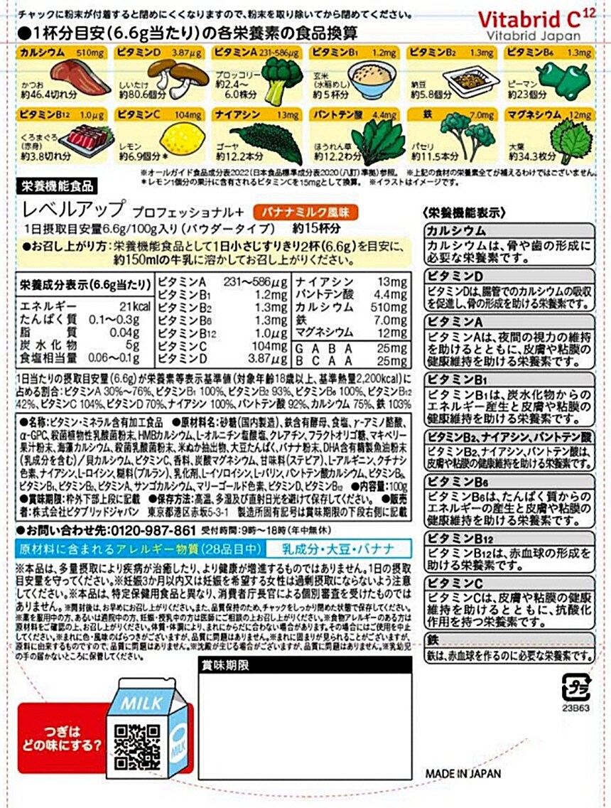 [6個]ビタブリッドジャパン レベルアップ プロフェッショナル プラス バナナミルク風味 100g | フレッシュで爽やかな風味が美味しい!