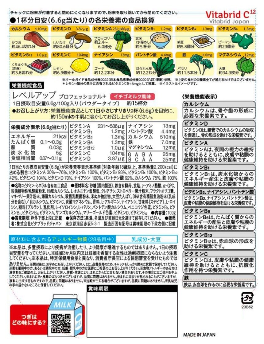 [9個]ビタブリッドジャパン レベルアップ プロフェッショナル プラス イチゴミルク風味 100g | 優しいほのかな甘さが広がる!デザート気分で!
