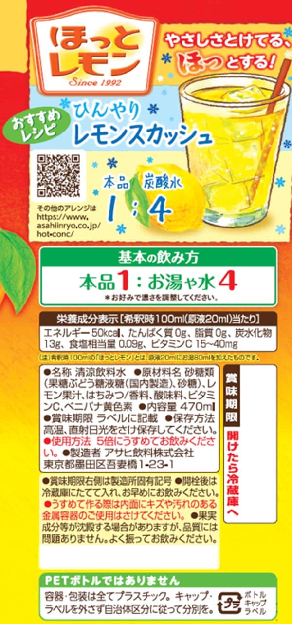 [24本]アサヒ飲料 ほっとレモン(希釈用) プラスチックボトル 470ml | レモン果汁にはちみつを加えた、心も体もほっと温まる、やさしい味わいが楽しめる希釈タイプのホット飲料です。